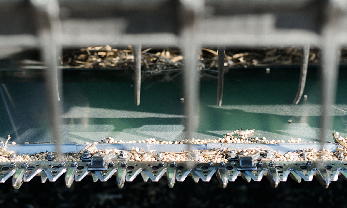 Combine Head: A revolving reel (soybean head) with metal teeth used to cut crops. Different combine heads are needed for different crops.